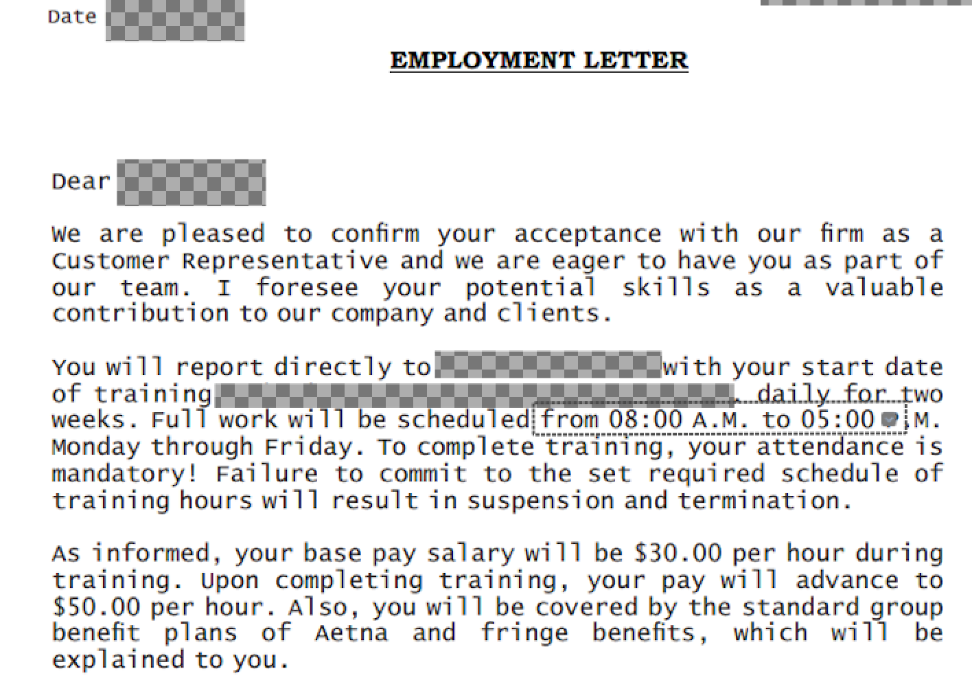 Scammers have refined their tactics to appear increasingly legitimate. They often create detailed profiles mirroring genuine recruiters, complete with company logos and professional branding materials. They may send official-looking documents and create a false sense of urgency around "immediate opportunities." Below is a fictional employment letter created using real threat actor trends.