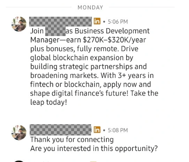 These fraudulent activities aren't limited to a single platform - they occur across numerous professional networking sites, email communications, messaging platforms, and social media. The sophistication of these attacks makes them particularly challenging to identify at first glance. See an example of a real recruitment scam below with sensitive information redacted. As we explain in the next section, notice the red flags of the really high salary range for the low years of experience.